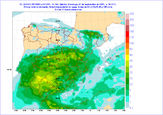 | Modelo del Centro Europeo, precipitación acumulada en 72 horas, desde el jueves 29 a las 00 hasta el sábado 31 a las 24 horas. |